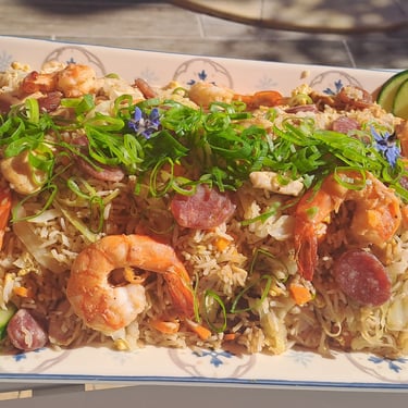 Riz sauté aux poulet, crevettes, et légumes et oeufs garni de ciboule